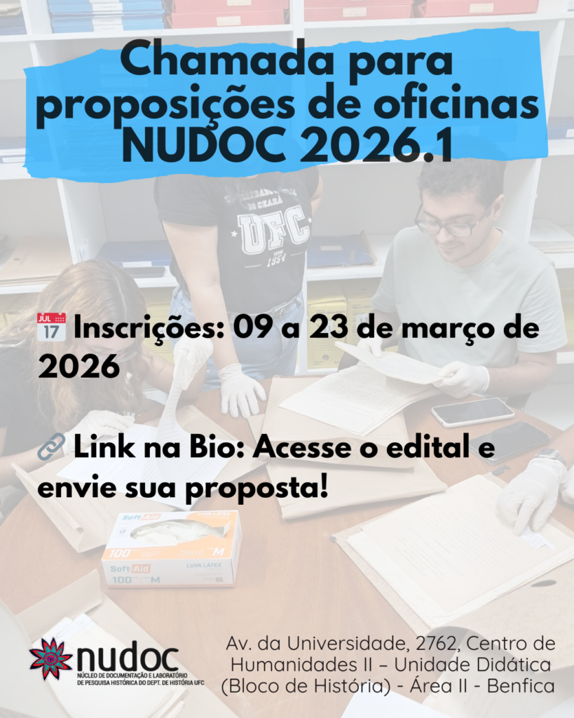 Data da publicação: 16 de março de 2026 Categoria: Notícias, oficinaAté o dia 23 de março de 2026, permanecerá aberta a chamada pública para a proposição de oficinas presenciais no Núcleo de Documentação e Laboratório de Pesquisa Histórica – NUDOC, a serem realizadas de abril a junho de 2026.
